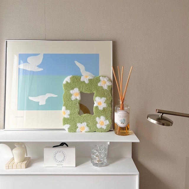 ---------------- ご注文の際はトップページのinformationを 合わせてご確認ください。 ---------------- <受注生産> 毛糸でできたフレームのミラーです。 これ一枚で韓国っぽいトレンド感のあるお部屋に! ミルキーなオフホワイトを使用し柔らかく仕上げました。 立てかけ・壁掛け対応 サイズ:30×25cm ◎ハンドメイドのため、ひとつひとつ形や模様に 若干の違いがございます。あらかじめご了承ください。