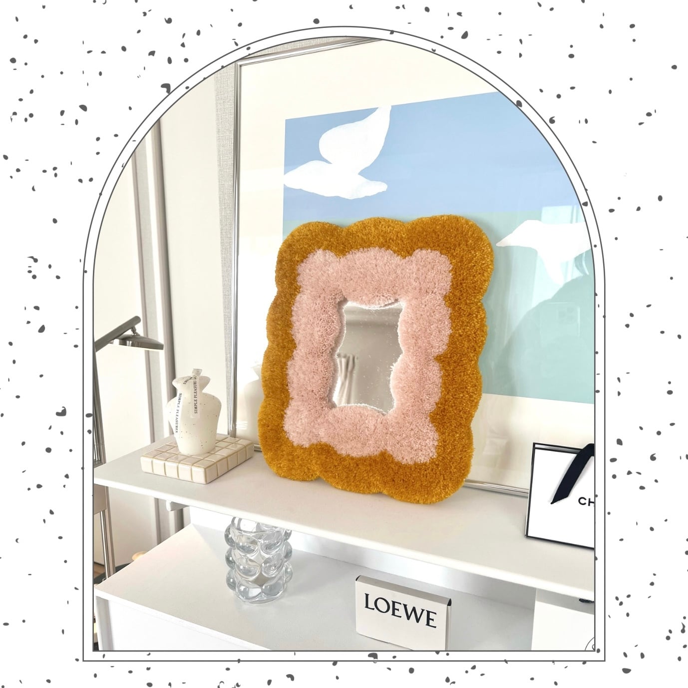 ---------------- ご注文の際はトップページのinformationを 合わせてご確認ください。 ---------------- 毛糸でできたフレームのミラーです。 もくもく模様がお部屋のちょっとしたアクセントに。 立てかけ・壁掛け対応 サイズ:30×25cm ◎ハンドメイドのため、ひとつひとつ形や模様に 若干の違いがございます。あらかじめご了承ください。
